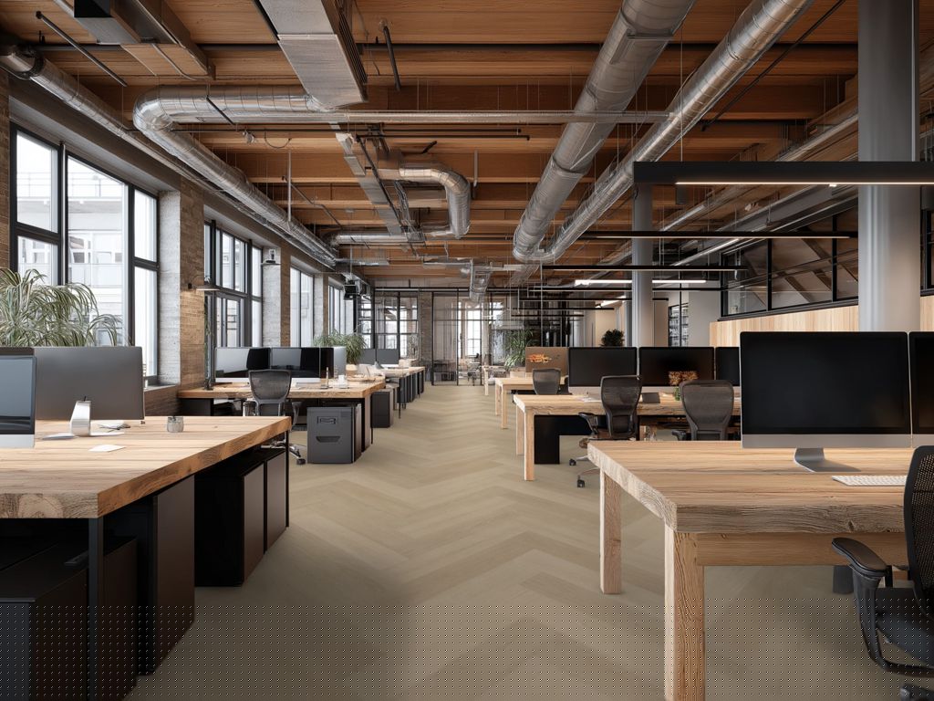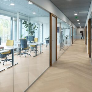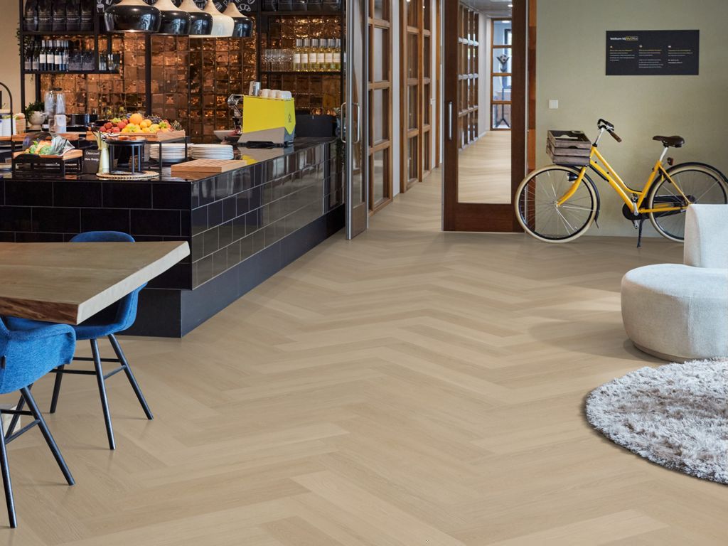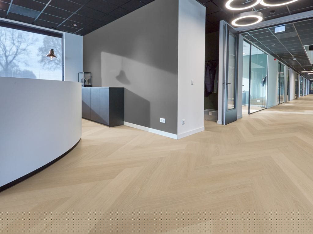 De extra brede en lange visgraatvloer P715 is vervaardigd uit meer dan 50% gerecycled materiaal en past perfect binnen moderne projecten met duurzame ambities. De natuurgetrouwe structuur en extra matte toplaag zorgen voor een authentieke en hoogwaardige uitstraling. Geschikt voor vloerverwarming en -koeling, waar comfort en functionaliteit samenkomen. Dankzij de geïntegreerde 10 dB geluiddempende SRC onderlaag voldoet deze pvc vloer aan de eisen voor appartementen, kantoren en grootschalige projecten.