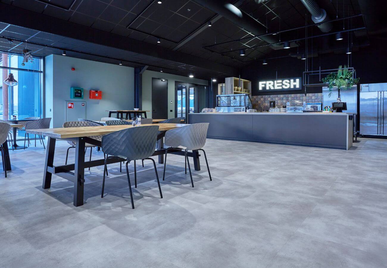 Daarnaast is er gekozen voor een stoere betonlook. Deze moderne tint brengt een eigentijdse, licht industriële sfeer die perfect past bij de frisse uitstraling van het kantoor. Strak, minimalistisch en toch veelzijdig. Deze projectvloer in betonlook vormt een robuuste basis die moeiteloos combineert met uiteenlopende ruimtes. Zo krijgen de werkplekken een professionele, moderne look.