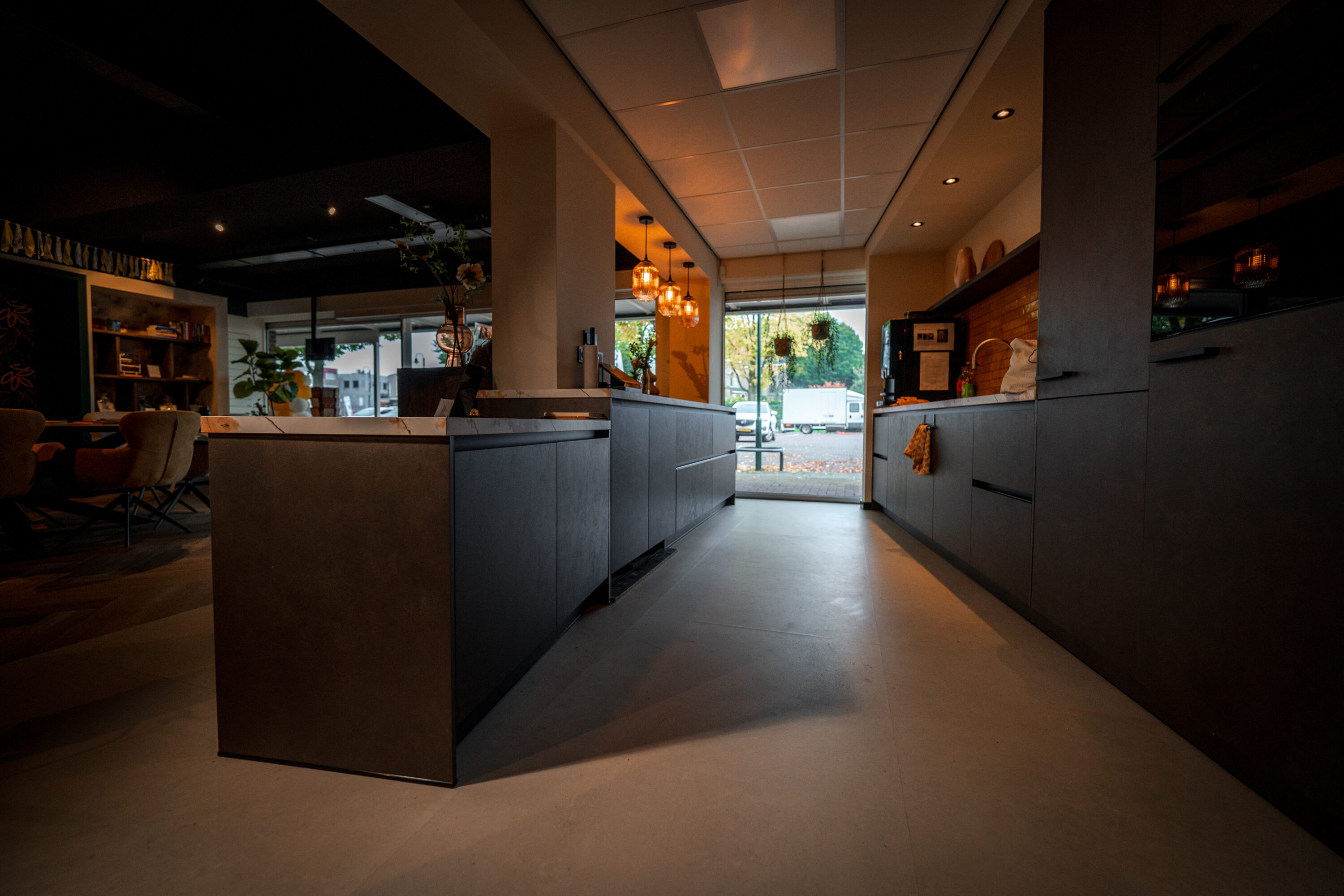 In de keuken is gekozen voor de P300 dryback beige: een duurzame en functionele betoonlook pvc vloer. Deze pvc vloer is slijtvast, milieuvriendelijk en eenvoudig te reinigen. Dankzij de hoge kwaliteit is hij perfect bestand tegen intensief gebruik, ideaal voor een ruimte waar veel mensen samenkomen. Zo combineren we optimaal comfort en professionele kwaliteit met een verantwoorde, toekomstbestendige keuze.